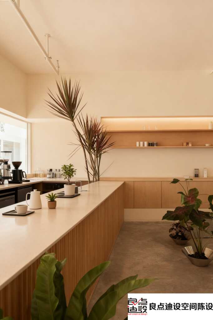 这种日式简约风为啥这么火?我跟你唠唠,它核心就俩字:自然。材质多用木材、棉麻、绿植,颜色以中性色为主,像图片里的木色、白、灰,高级又不冷淡。咖啡店用上这个风格,立马营造出宁静、治愈的氛围,年轻人可爱这个了——点杯拿铁,能窝一下午,还能疯狂打卡。软装细节上,注意纹理搭配:粗布沙发套、藤编篮筐、陶瓷杯具,加上暖光灯光,温馨感直接拉满。冰箱那种大件电器可以藏起来或选嵌入式,保持视觉整洁。对了,别忘了动线设计,桌子别摆太密,留出拍照角落,小红书上的爆款店都这么干!