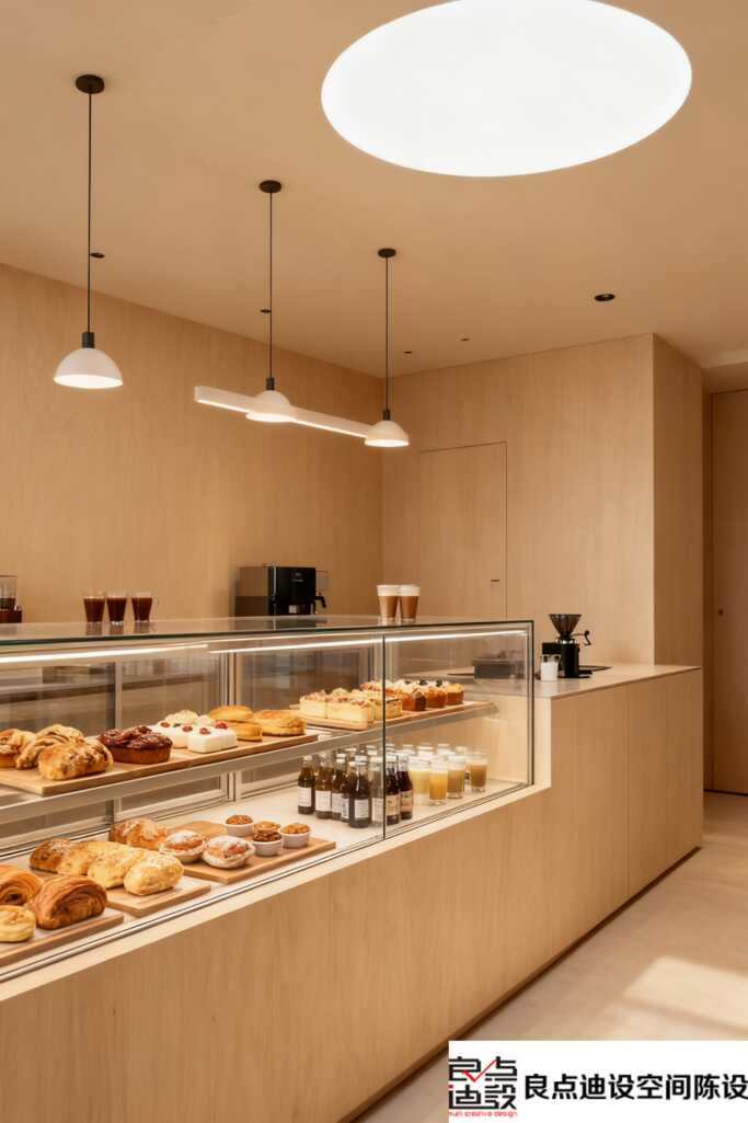 吧台区绝对是视觉C位!? 玻璃展柜里满满当当地摆着欧包、可颂、小蛋糕…颜值高到不像话,灯光一打,那个光泽感简直就是在对你招手“快来吃我!”。上方的吊灯也暗藏心机,线条极简,但造型很有记忆点,光线是暖暖的柔光,把食物的色泽和吧台的质感烘托得恰到好处,氛围感直接拉满。