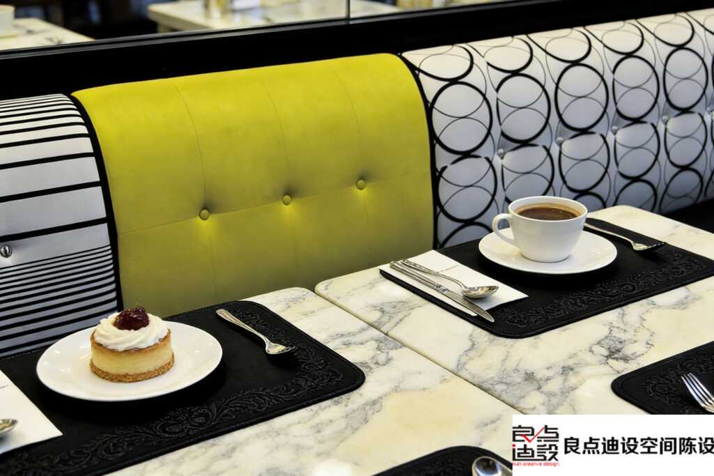 深入聊聊软装风格。这家店走的是现代简约路线,但绝非“性冷淡”——亮黄色绒面革靠背就是证据,一下子打破沉闷,让空间活了起来。软装设计嘛,说到底就是“少花钱办大事”:靠背分区不仅美观,还巧妙增加私密性;几何图案注入艺术感,避免单调;材质混搭提升触觉体验。这种设计超适合小户型咖啡店,视觉上不挤,还能突出焦点,软装团队“良点迪设空间陈设”果然专业,把色彩和功能拿捏得死死滴。