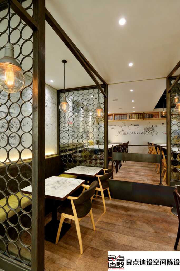 这绝对是空间里的C位担当。金属细框勾勒出几何圆形,光影穿过镂空,在地上墙上落下斑驳的影子。它巧妙地把大空间做了柔性分区,保证了每桌客人的小私密,视线却能延伸出去,丝毫没有压抑感。这种“呼吸感”,是高级设计里最难拿捏的。