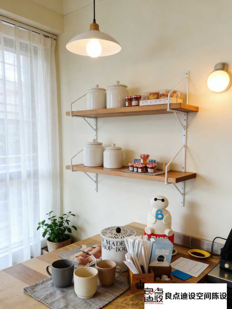 墙面两层原木色搁板,一眼干净。上面没堆杂货,就几只白色陶罐、几个果酱瓶,再加几包小点心,随意一摆,生活气立马就来了。重点来了哦,这种“留白式”陈列,既展示了商品,又不显拥挤,视觉上超级放松。旁边那句手写体“MADE WITH LOVE”,和木质调的温暖感配一脸。