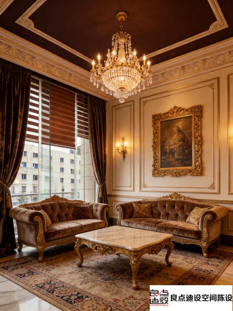 整体来看,这个设计的配色高度统一,棕、金、米白为主,经典耐看,高级感就是这么来的。家具的布局也很有节奏,疏密有致,不会挤得慌,也不会空荡荡。所有软装元素——家具、灯具、布艺、挂画——都在共同讲述同一个“欧式古典浪漫”的故事。