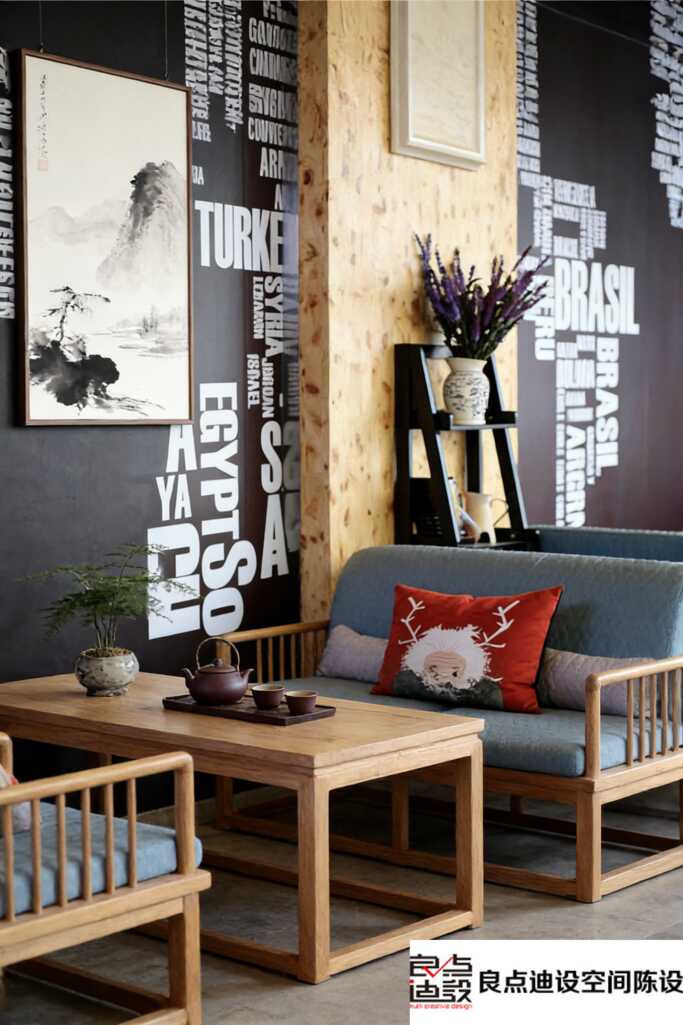 一进门,视觉重心就被那面木质墙面锁死了。暖调原木瞬间柔化了空间,但仔细瞅,墙上可不是简单装饰——黑白艺术字错落排列着“BRASIL”“TURKEY”这类单词,工业范儿十足,像是随手泼墨的现代诗歌。这种墙面处理妙啊,既保留了工业风的冷峻骨架,又用材质打了层柔光。转角处,一幅中式山水画静静挂着,墨色淡雅,和旁边张扬的艺术字一静一动,反差萌拉满!软装里,这种“对冲手法”用得贼巧妙,文化氛围一下子就立住了。