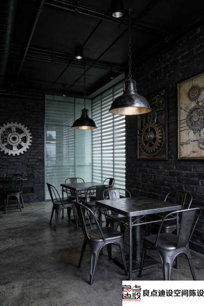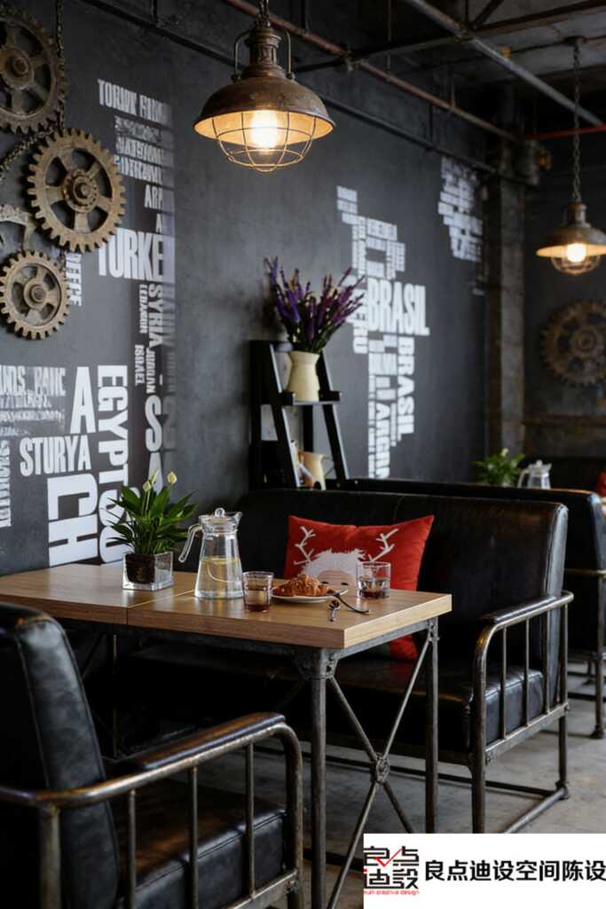 工业风最怕做得冷冰冰像仓库。这家店聪明在哪?深灰色墙面打底,高级感瞬间上来。但重点来了!墙上可不是光秃秃的,那些白色艺术字装饰“TURKEY”、“BRASIL”、“PARIS”,一眼就带你环游世界咖啡产区,故事感拉满。再配上点睛的复古金属齿轮装饰,工业的“魂”就有了,而且一点都不沉闷,反而像在看一本立体的旅行日志。