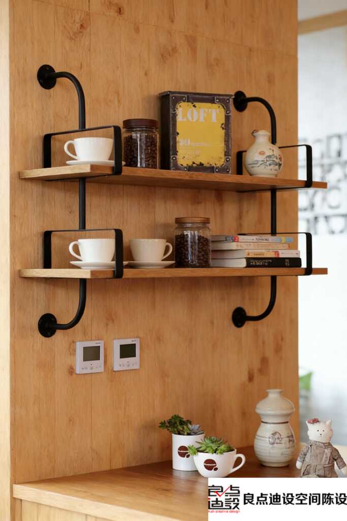 整张图最吸睛的就是墙面这个双层置物架——黑色金属支架搭原木层板,经典工业风配置,硬朗又不失温度。上层摆了一排纯白咖啡杯,干干净净的,和深色背景撞出高级感;中间玻璃罐里装满咖啡豆,瞬间带出“专业烘焙工坊”的沉浸气息。下层那些复古铁盒、陶罐小花瓶,细节控看了直呼过瘾,每一样小物都不是随便放的,像在悄悄讲述空间的故事。