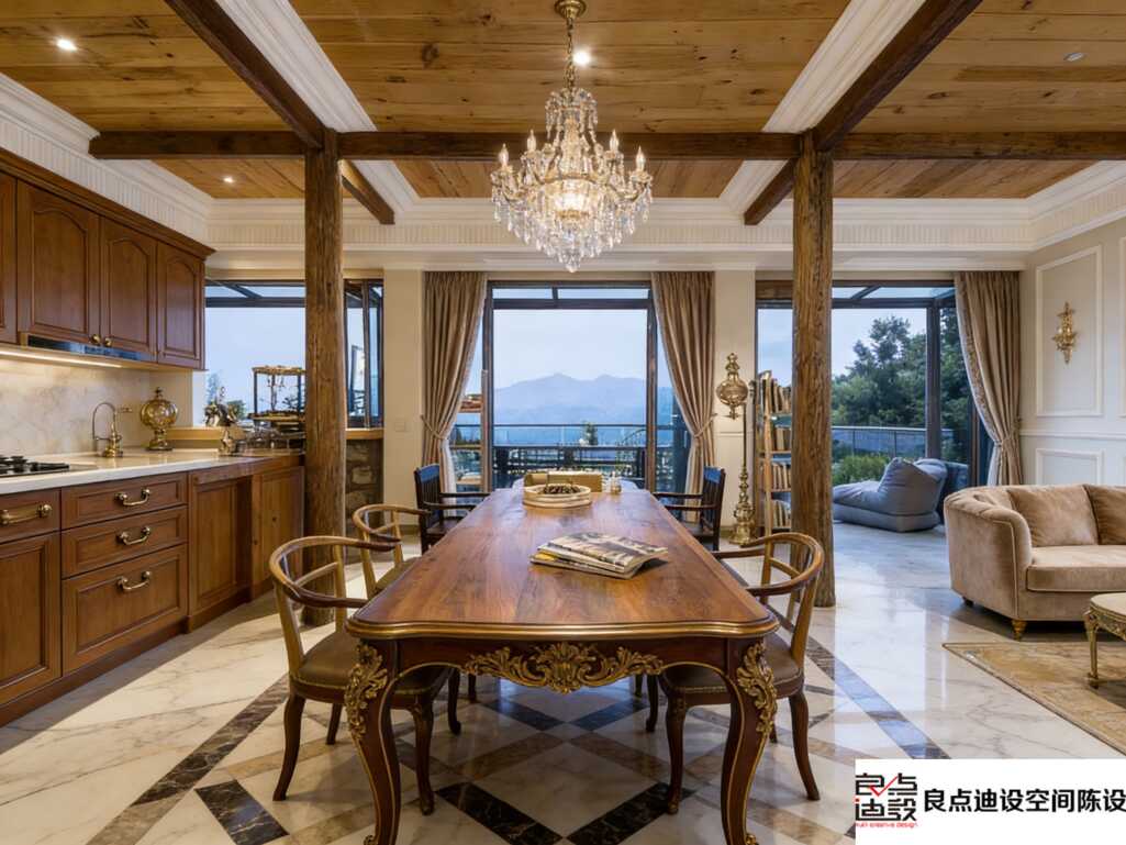 一进门,视线绝对被这张超大实木餐桌锁死。木质温润厚重,搭配的几把椅子线条却极简,一繁一简,层次感瞬间就出来了。仔细看餐桌边缘的金色雕花,精致不浮夸,一下把轻复古的味儿给勾出来了。头顶那颗blingbling的水晶吊灯才是灵魂,光线一打,整个区域的氛围感和高级感“啪”一下就上来了,拍照根本不用滤镜。