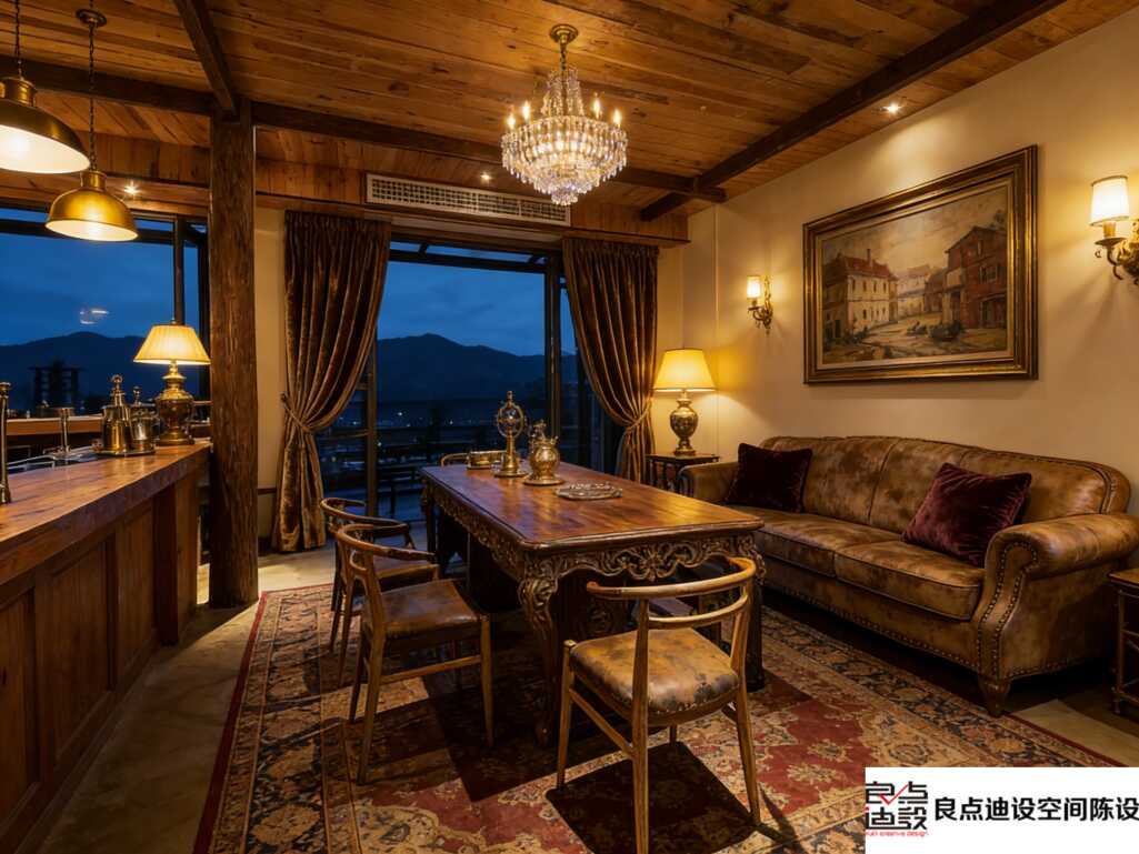 木质天花板的温润质感,搭配上那盏线条华丽的水晶吊灯,一刚一柔,氛围的基调就这么稳了。光有硬装不够,软装才是赋予空间性格的关键。