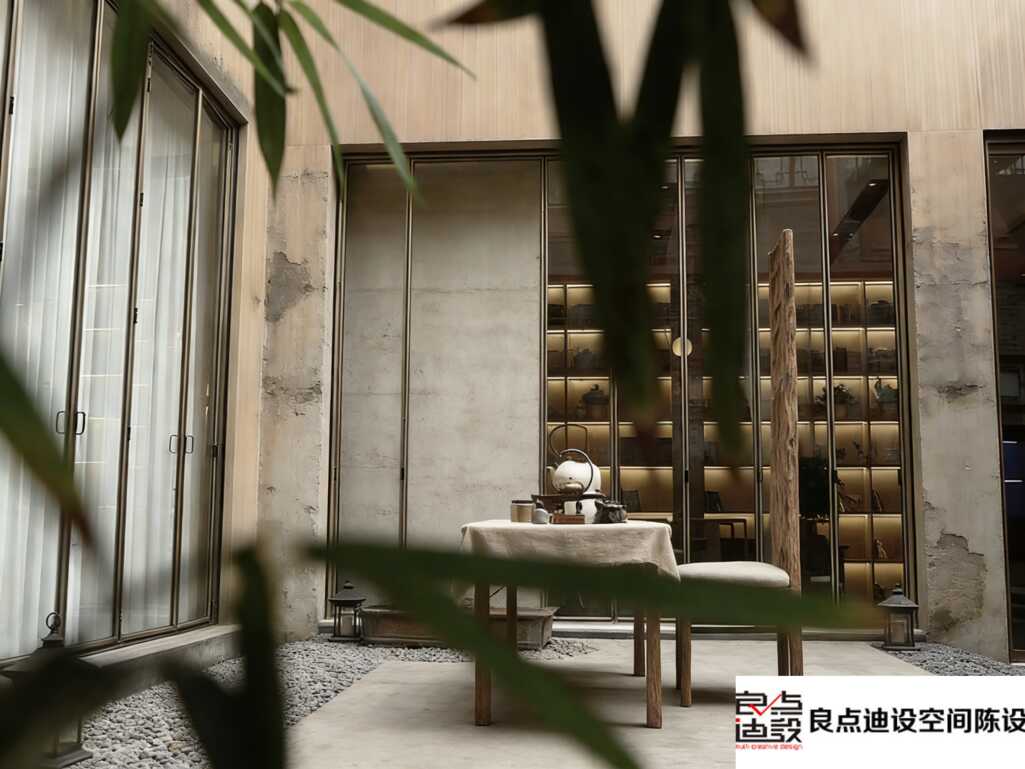 背景墙的魔法: 你们看图片!粗糙的清水混凝土墙面,那种天然的肌理感和岁月痕迹,跟光滑温润的木桌形成了绝妙对比。一冷一暖,一粗一精,这种冲突感太高级了。旁边整面的透明玻璃窗,又把室外的光线和景致引了进来,空间瞬间通透,传统和现代融合得毫不费力。