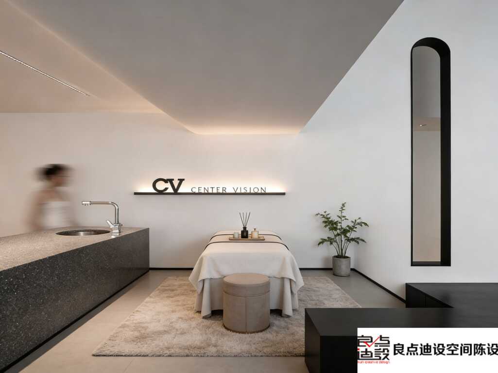 再说软装细节,那可是重头戏。中间摆着一张美容床,铺着纯白床品,简约到极致,但舒适度满分。旁边配了个小圆凳,线条流畅,和床搭起来就像一套定制款,整体性超强。宝子们,软装里家具选对了,空间立马活起来,千万别东拼西凑,统一风格才是王道!
