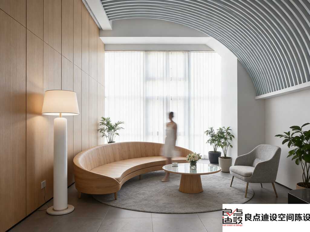 一进门,视线直接被这个弧形木质沙发勾住👀 温润的木纹肌理搭配极简流线型设计,没有一丝多余赘饰。重点是——它瞬间定下了整个空间的基调:温柔、包容、毫无攻击性。旁边那盏白色落地灯简直神助攻,光线柔得像一层薄纱,让等待区变成了“疗愈前奏区”。