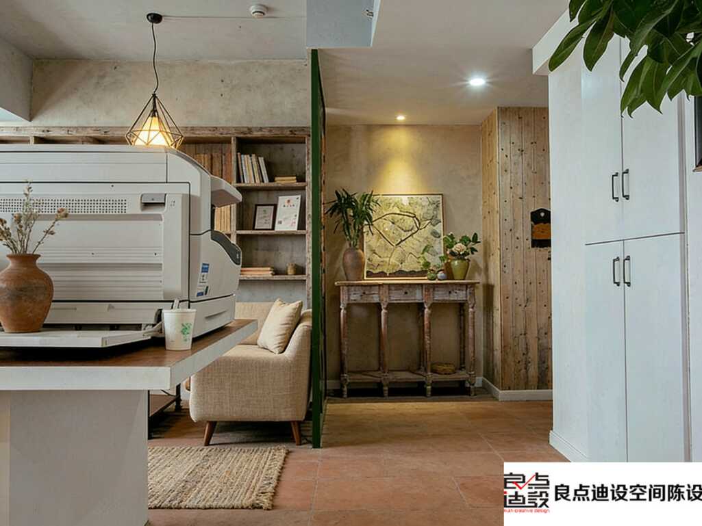 那个藤编吊灯绝了!暖黄光线透过藤编纹理洒下来,瞬间把“冷职场”变“治愈小馆”。软装里的灯光设计超重要,不用主灯也能营造温馨感,晚上加班也不会觉得压抑,反而像在家工作一样舒服~