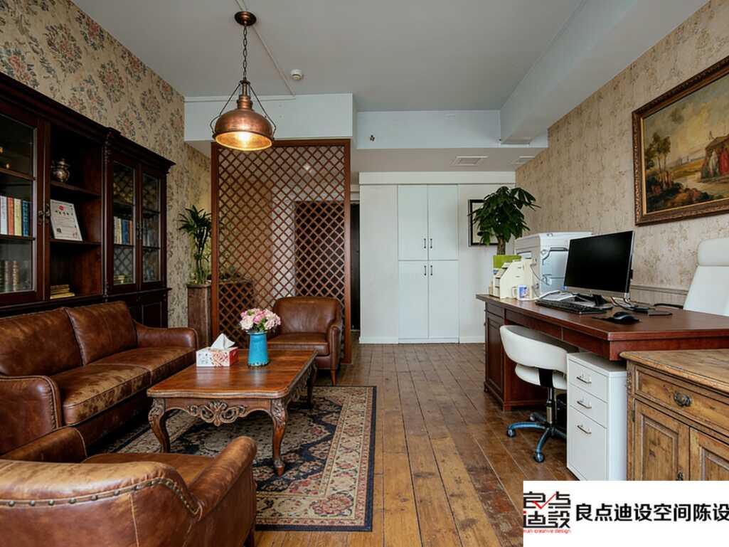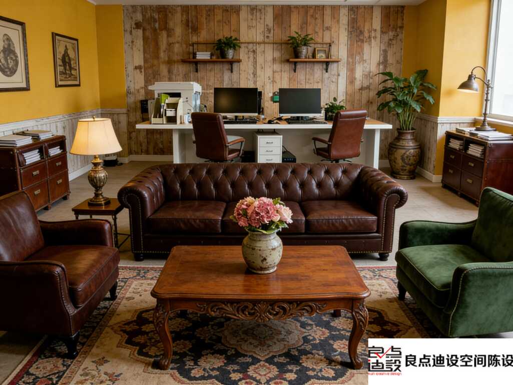先唠唠整体氛围:深棕皮质沙发+雕花实木茶几+做旧地板,搭配碎花墙纸和铜色吊灯,复古感直接拉满,但完全不会压抑,反而透着慵懒的高级感~这种风格太适合想打造“有温度办公空间”的公司了,员工待着舒服,客户来也觉得专业又亲切~