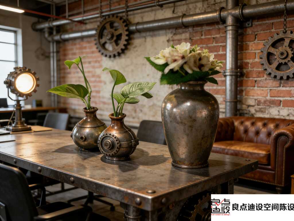 🔧【软装灵魂:复古机械+自然生机】