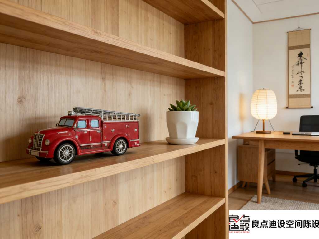 先看这个「原木书架区」,浅橡木色的层板自带温暖滤镜,纹理清晰得像把森林搬进办公室~ 摆的不是千篇一律的文件盒,而是一辆复古红色消防车模型!金属轮毂+做旧漆面,精致又带点童趣,瞬间打破办公空间的沉闷感(谁还没个童心呢!)。旁边配个白色几何花盆,小多肉乖乖待着,绿意和木色撞出清新感,连空气都变得柔软起来~