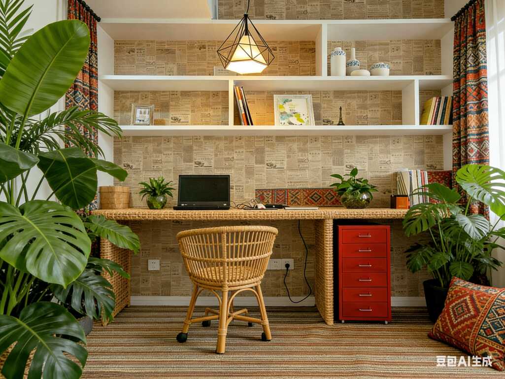 🛋️【软装小心机大公开】 ▫️办公区:藤编椅配亚麻坐垫,久坐不累还自带ins滤镜;超长原木书桌配草编桌垫,键盘敲着都像在沙滩打字 ▫️绿植区:琴叶榕+龟背竹+垂吊绿萝,用藤编花盆和竹篮收纳,连垃圾桶都是棕榈叶造型(细节控狂喜) ▫️墙面装饰:冲浪板挂画+热带花卉壁画,连窗帘都印着椰树图案,同事说每天上班像去海岛团建