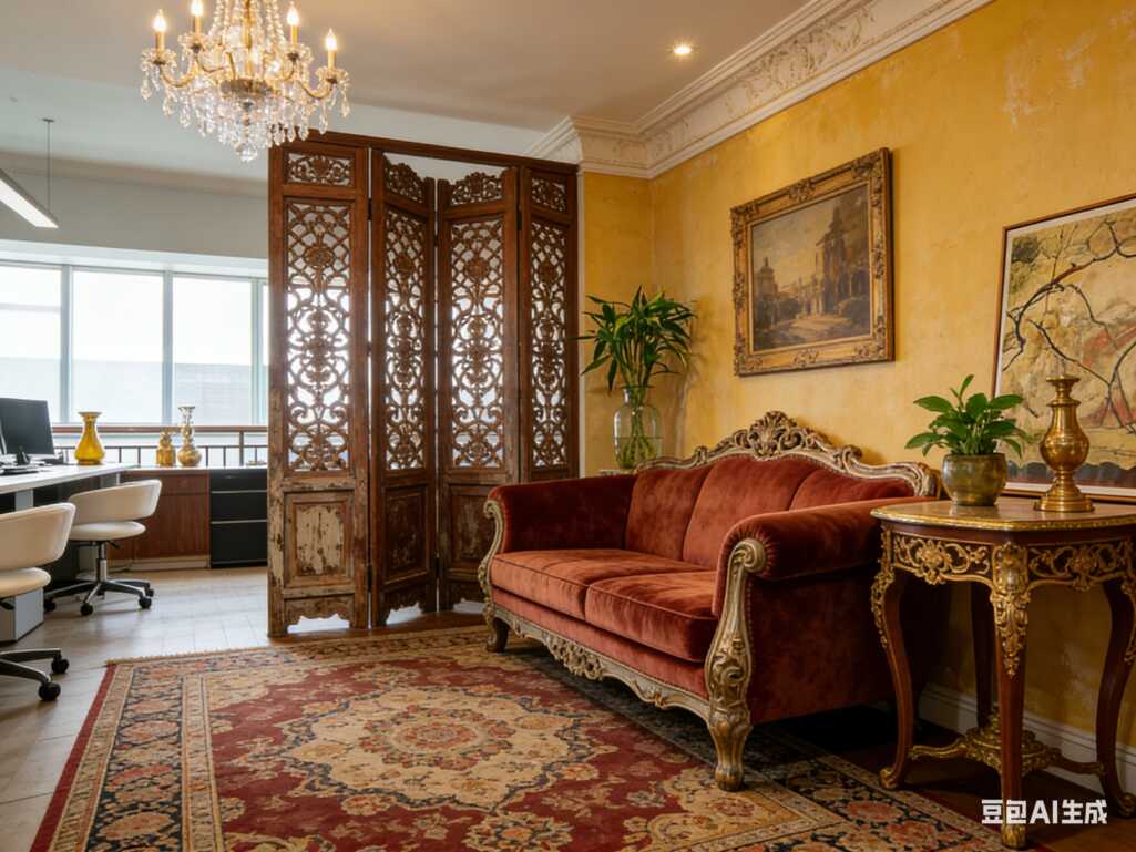 还有这个铜制吊灯,做旧质感绝了,暖黄灯光打下来,整个空间温柔又高级。窗边的花纹窗帘和格纹地毯,把复古氛围贯彻到底,阳光透进来的时候,光影落在地板上,连加班都变成了一种享受。