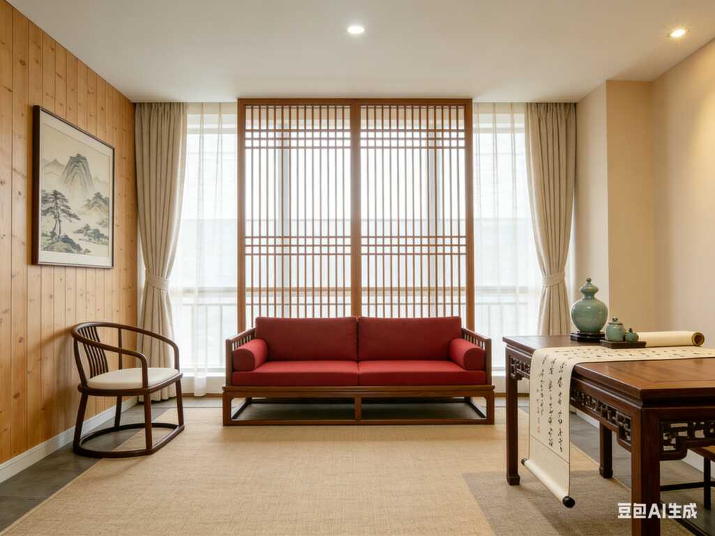 红木色的罗汉床简直是点睛之笔!本来担心传统家具会显老气,结果配了酒红色坐垫,瞬间年轻十岁。客户来了往这儿一坐,品着茶看着墙上的《富春山居图》复刻版,商务谈判都变成文化交流现场~