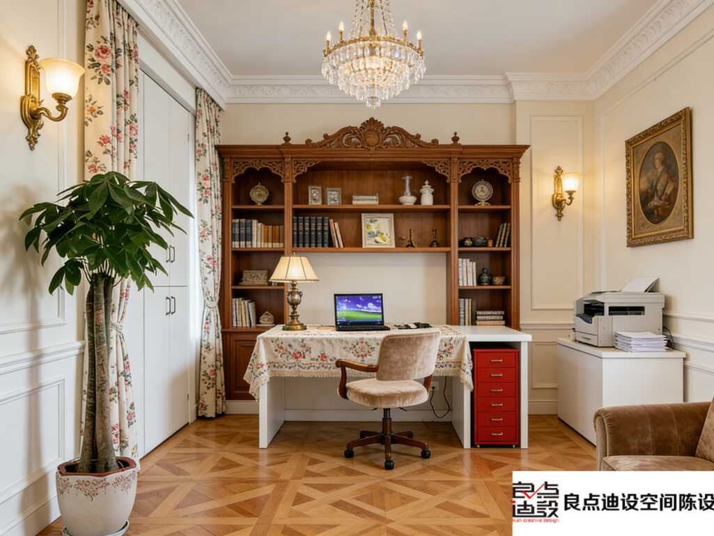 3️⃣ 灯光层次感绝了:水晶吊灯负责主照明,壁灯打亮护墙板的浮雕纹理,书桌上再放盏黄铜台灯,晚上加班都觉得是种享受~