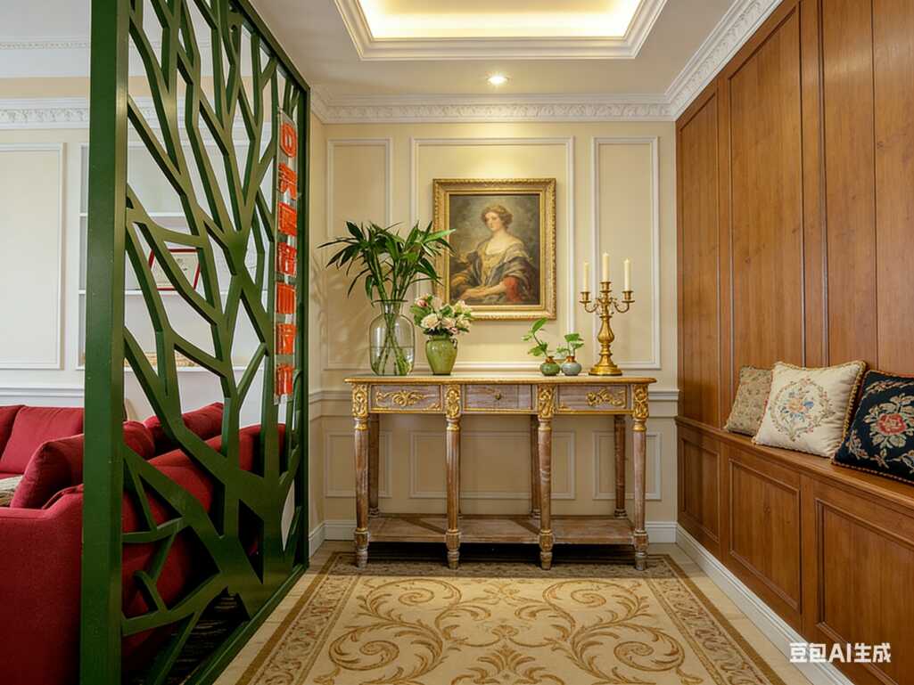 ✨【软装小心机】 • 定制绿植造型屏风,既能分隔空间又超有设计感 • 地毯选了卷草纹图案,和护墙板花纹呼应绝了 • 黄铜五金件贯穿全场,轻奢感拿捏得死死的 • 墙面留白处挂复古油画,艺术气息up up!