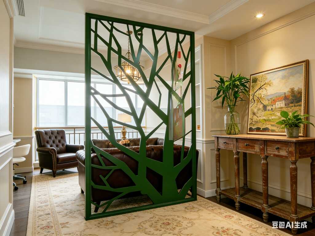 这次接的这个小老板办公室改造,我直接把美式复古风玩明白了🥳 看完甲方当场说要给我介绍新客户! 进门第一眼就是这个祖母绿树形镂空隔断👏 谁能想到这个软装小心机直接解决了户型硬伤!原本进门就能看见整个休息区,没有隐私感还显杂乱,做个实心墙又闷又挡光,这个镂空隔断太绝了——既隔出了动线分区,绿意树枝的镂空完全不挡自然光,深绿色配浅奶黄的墙面,撞色直接把层次感拉满,随手拍都是大片📸