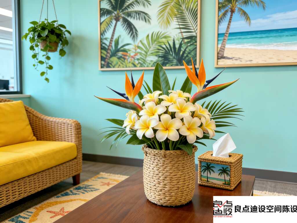 做办公室装修设计,最显质感的永远是细节!看这张图你就懂了:茶几上用草编篮插了鹤望兰和鸡蛋花,连抽纸盒都搭配了同系列椰海装饰画,角落垂吊的绿萝吸甲醛又添生机,藤编沙发+明黄软包坐进去就不想起来🥹 背景两幅椰岛海景画直接把度假氛围感拉满,地毯还做了海星暗纹,每一处小细节都踩在审美点上,完全不是堆材料的无效软装!