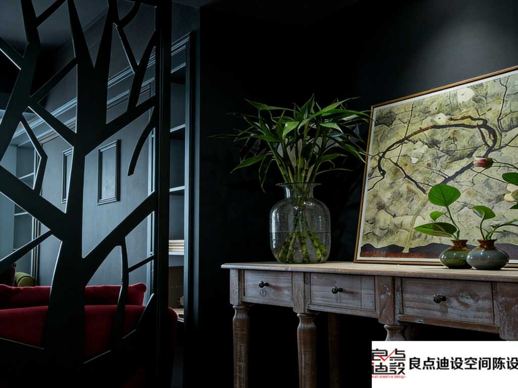 做隔断也没选死板的实体墙,用了黑色树形镂空屏风,既把开放区和玄关做了分区,又不挡光线,艺术感直接戳我心巴!👉 旁边露出来的正红色沙发跳脱出来,暗调里加一点亮色块,完全不会沉闷,反而多了松弛感~