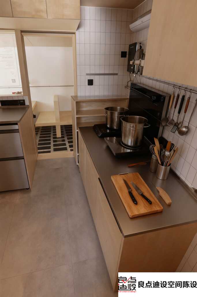软装的核心是功能性,这家店的分区做得超聪明。吧台区域用了银色冰箱和简约菜单板,金属质感点缀浅木背景,立马提升时尚度。菜单板字体清晰,复古又实用,绝对是软装中的小心机——既能引导消费,又能当拍照背景。开放式厨房那块儿,不锈钢锅具整齐挂放,专业感十足,但更妙的是它通过软装模糊了厨房与客区的界限,让制作过程变成一种视觉享受。地面铺了深色地砖,和浅色家具形成反差,层次感一下子就出来了,这种“硬软装结合”的手法,咱们日常设计也能抄作业!
