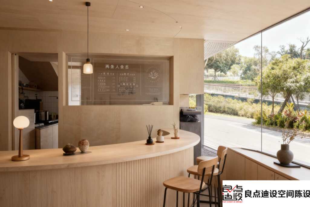 先看吧台,简直是整个空间的灵魂!浅木色的柜体,质感温润得像自然生长的老木头,没有一点冰冷工业感。上面几台黑色咖啡机一字排开,金属的硬朗和木质的柔和,碰撞出奇妙的反差萌。最绝的是那些开放式置物架,几袋咖啡豆随意搁着,既当装饰又讲故事,仿佛下一秒就能闻到烘培香气。这种细节,设计师真是把“自然简约”玩到极致了。